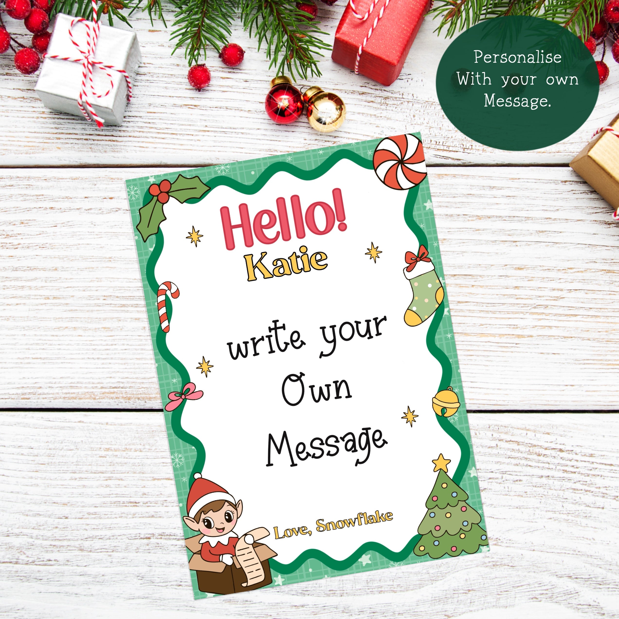 Letter is personalised with child/childrens name (only 3 names per card). If ordering for multiple children text will be adapted to suit. Optional choice to add Elf’s name/names to the bottom. Choice to add your own wording and create you own letter.